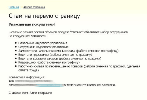 Это еще что, замечает Мария. Вон, менеджеры "Утконоса" прислали веб-мастеру объявление для сайта, снабдив его соответствующим заголовком, так объявление с этим заголовком очень самокритично и напечатали.