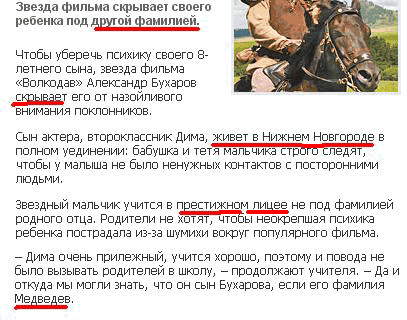 Мировая знаменитость (по версии отечественных СМИ) фильма "Волкодав" Александр Бухаров, как рассказал Сергей "S.L.", тщательно скрывает своего ребенка под другой фамилией - ну, чтобы поклонницы не сделали с дитем чего-нибудь страшного. Скрывает настолько тщательно, что о нем практически ничего не известно, и никаких данных о нем Бухаров в многочисленных интервью не приводит.
