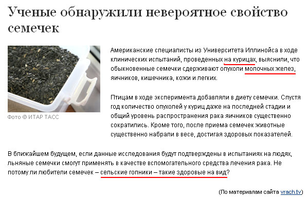 Ученые - молодцы, радуется Татьяна. Ладно - свойства семечек. А вот что они обнаружили у куриц молочные железы и выяснили причину здоровья сельских гопников - это просто прекрасно!