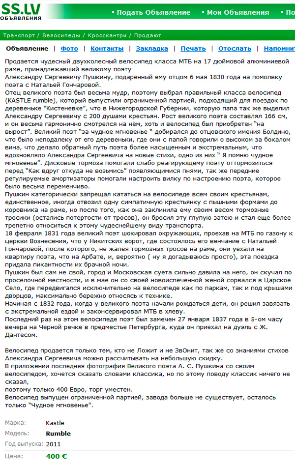 Про велосипед Пушкина - это просто "пир духа"! Прочитал два раза. На втором прочтении сполз под стол. 😄