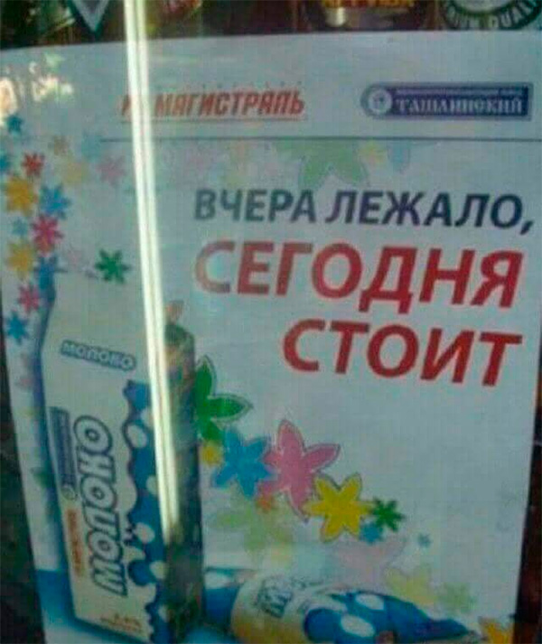 Андрей прислал чудесный креатив. Молоко у них вчера лежало, сегодня стоит. Видимо, это молоко из твердых сортов.