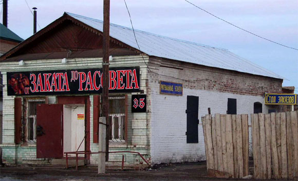 Во-первых, оно работает от заката и до рассвета, как и полагается приличному бару с вампирами. Только это не бар. Это контора ритуальных услуг (надпись справа). А если покойник никак не желает становиться таковым, то вот удобный сервис - прямо в этом доме есть "Стол заказов". Заказал кандидатуру, заплатил денежки - через пару часов уже заносят с торца. Вот такое потрясное заведение...