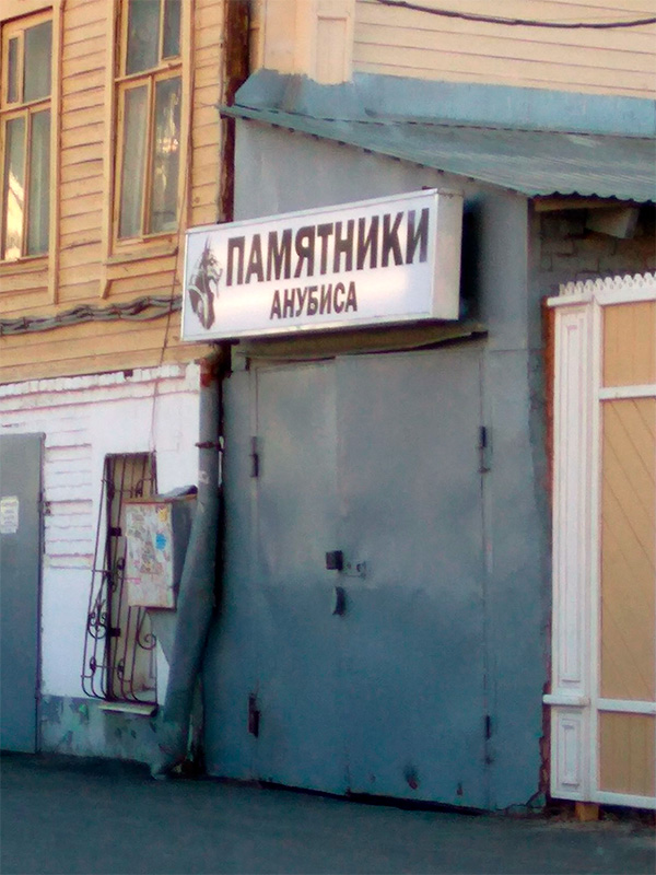Название "Памятники Анубиса" для конторы, изготавливающей памятники для установки на могилах, говорит о том, что ее хозяева (несмотря на непрезентабельный вид самой конторы) явно имеют представление о древней истории (бог Анубис - покровитель некрополей и кладбищ, один из судей царства мёртвых в Древнем Египте), а также своеобразное тонкое чувство юмора.