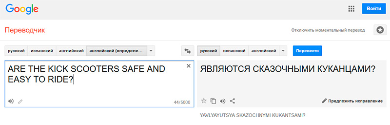 Мне не удалось воспроизвести гуглоперевод. Мой гугль переводит вполне адекватно: "являются ли скутеры безопасными и удобными в управлении?"