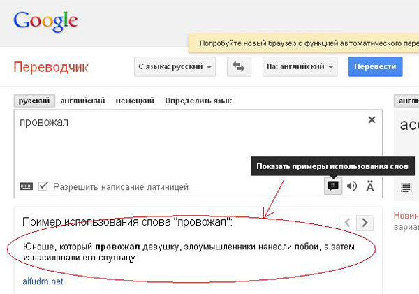 Впрочем, замечает он, Google также очень заботлив в приведении примеров использования слов.