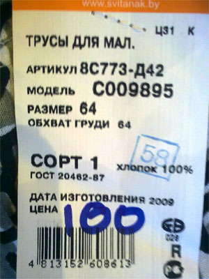 Варакина, Бухна и Киселева купили в магазине "Белорусского белья" вот такие прекрасные трусы для малыша 64 размера с обхватом груди в 64. Крупненький вообще такой малышок...