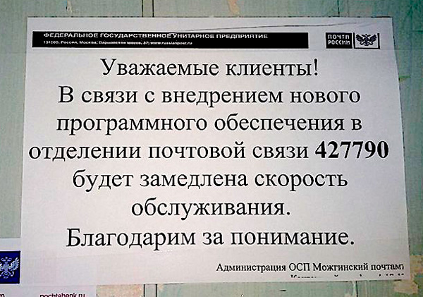 "В связи с внедрением нового ПО будет замедлена скорость обслуживания" - это, так сказать, истина, которая касается не только почты, но и абсолютно всех госорганизаций, связанных с обслуживанием граждан!