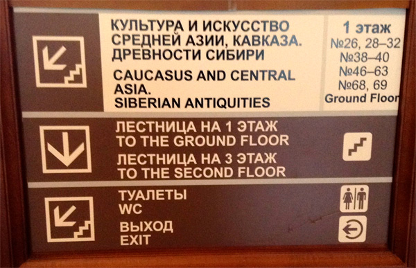 За что Андрей любит Эрмитаж - так это за простые и понятные указатели. Вниз по лестнице - культура и искусство Средней Азии. Лестница на первый этаж - тоже вниз, но уже отвесно.
