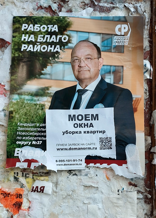 Наклеенное объявления поверх плаката этого хорька из едросни - уж точно работает на благо района, в отличие от самого хорька, считает Олег.