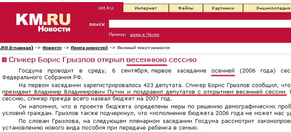 Душевно отдохнули депутаты, завидует Константин. Аж осеннюю сессию с весенней перепутали. Впрочем, гарант тоже перепутал, хотя вроде и не отдыхал. А может, это новостисты KM.ru слишком хорошо отдохнули - бывает. Хотя они обычно всегда в слишком хорошо отдохнувшем состоянии - фактически работают, не приходя в сознание.