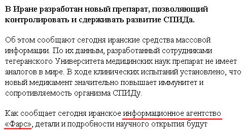 Главное - замечает Анатолий Игнатов - это чтобы новостное агентство заслуживало внимания. Данное - явно заслуживает. Завтра они сообщат о лекарстве против рака, послезавтра - о лекарстве против декапитации. Вот только об одном они не сообщат - о найденном лекарстве против давно заболевшей головы своего президента.