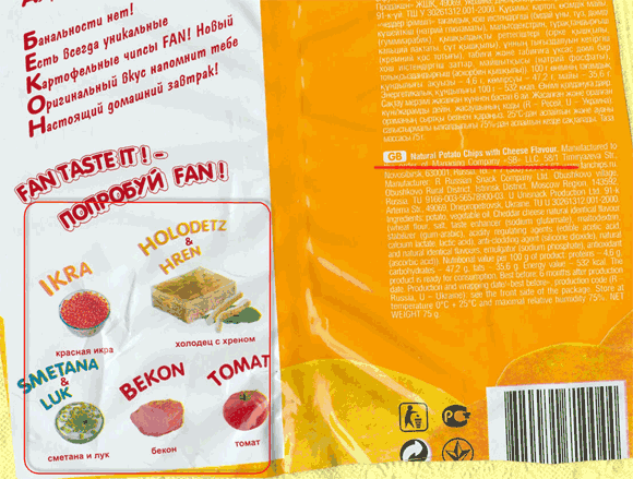 И вся эта иноземная радость (включая holodetz & hren) доступна любому желающему, не умеющему читать! Потому что те, кто читать умеют, в правой части этикетки обнаружат прозаическую надпись: "картофельные чипсы с сыром". И никакого тебе ikra, smetana & luk.