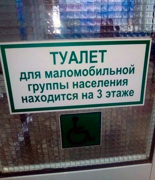 На самом деле, конечно, сделать туалет для инвалидов на каждом этаже не хватило денег - решили с переоборудованием помещения на первом этаже не возиться.