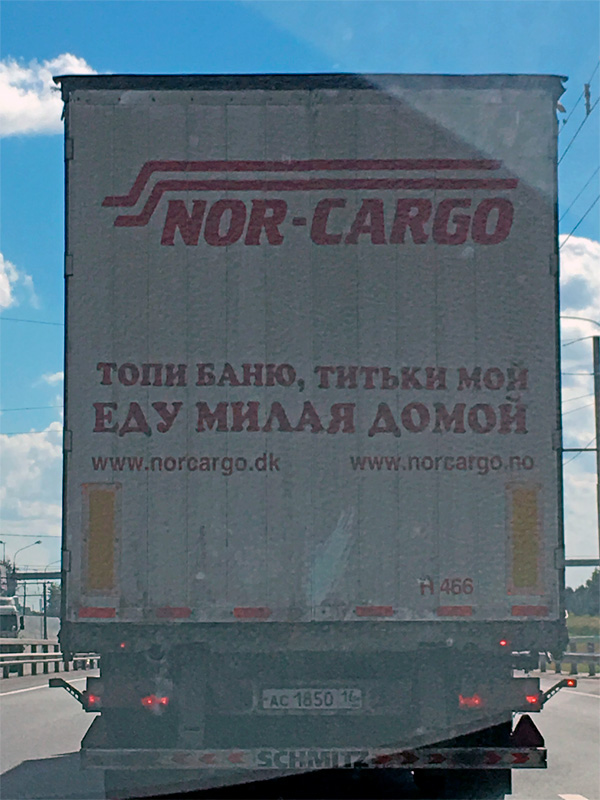 Особенно пикантно, замечает Илья, что это милое народное творчество написано на двери кузова норвежского грузовика. Так что еще не очень понятно, кто там должен мыть баню и топить титьки. Ой, наоборот.