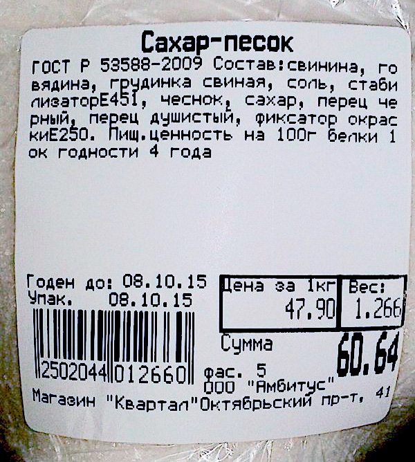 А почему на ценнике сахарного песка, изготовленного из свинины и говядины, измеряется пищевая ценность белки?