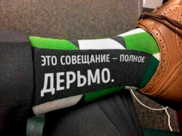 Можно устроить флеш-моб. Во время очередного видеозвонка всем положить ноги на стол на американский манер в поле зрения камер. В этих носках, конечно.