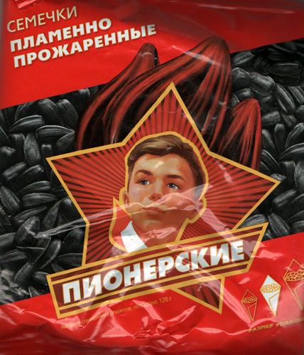 А вот тоже интересный креатив, считает Etaru. Семечки пламенно прожаренные пионерские. На золотых пионерских кострах. С пламенно патриотической песней. Интересно, Зюганову пару пакетиков отправили?