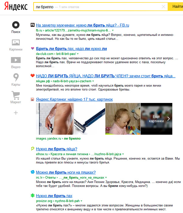 В третьем ответе яндекса - "...чтоб научиться брить моего парня и мои яички...