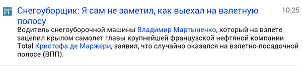 "Российская газета", рассказал Александр, поведала всю правду о происшествии. Снегоуборочная машина, оказывается, тоже пошла на взлет.