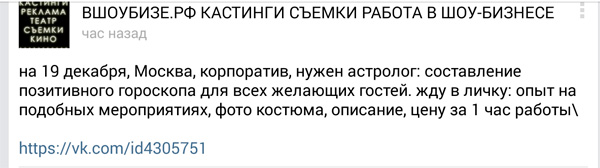 Нужна работа в шоу-бизнесе, спрашивает Алексей, - вот, пожалуйста. Не забудьте только, что все гороскопы должны быть строго позитивные - в жопу эти планеты, профессиональный астролог за сто баксов луну всегда в нужный дом поставит.