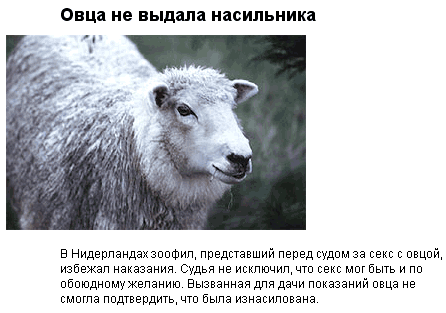 Случай, кстати, совершенно реальный, это не хохма. И теперь все зоофилы могут расслабиться: достаточно перед своим негодяйским действом нацепить на овцу чулки с подвязками - и все, это будет четким доказательством, что она сама хотела и даже хорошо подготовилась!