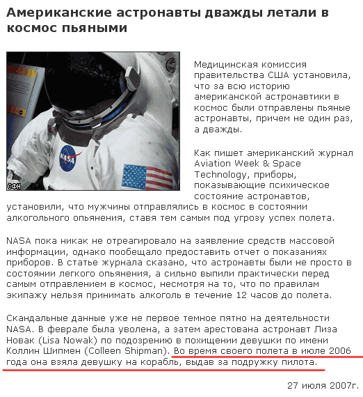 Alex-Utah выяснил совершенно жуткие подробности о бесчинствах космонавтов NASA. Оказывается, они не только нажирались перед полетом! Они еще и в космос таскали своих подружек!