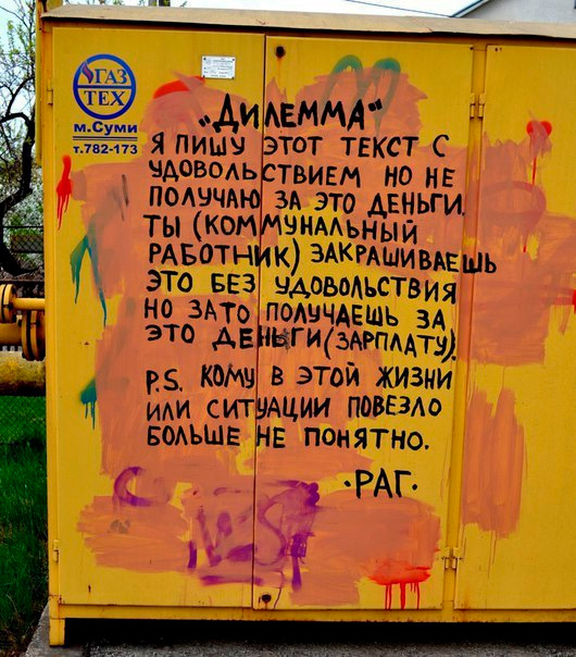В первом случае работник коммунальной сферы получит удовольствие от осознания общественной полезности своего труда. Во втором случае: "вот жеж кто-то трудился выводил буковки, а я вот возьму и закрашу все нафиг!"