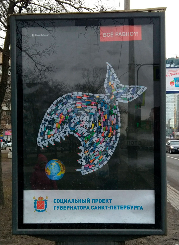 Давайте выясним, дети, что художник хотел сказать этой картиной? Что наш земной шарик поглотят стеклянные бутылки? Так они вроде как идут на переплавку. Что наш земной шарик поглотят пластиковые бутылки? Так их вроде сейчас тоже стали принимать на переработку. Что от нас вообще хочет губернатор Санкт-Петербурга, кто может понять?