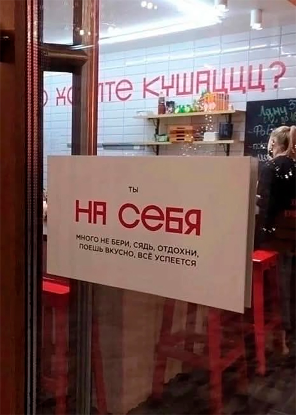 Бегущая надпись на бусике с "фруктами, овощами, прости..." тоже неплохо вставляет.