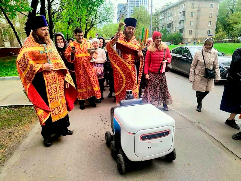 Картина маслом, рассказал Лука. Попы благословляют робота, доставляющего святую воду пастве.
