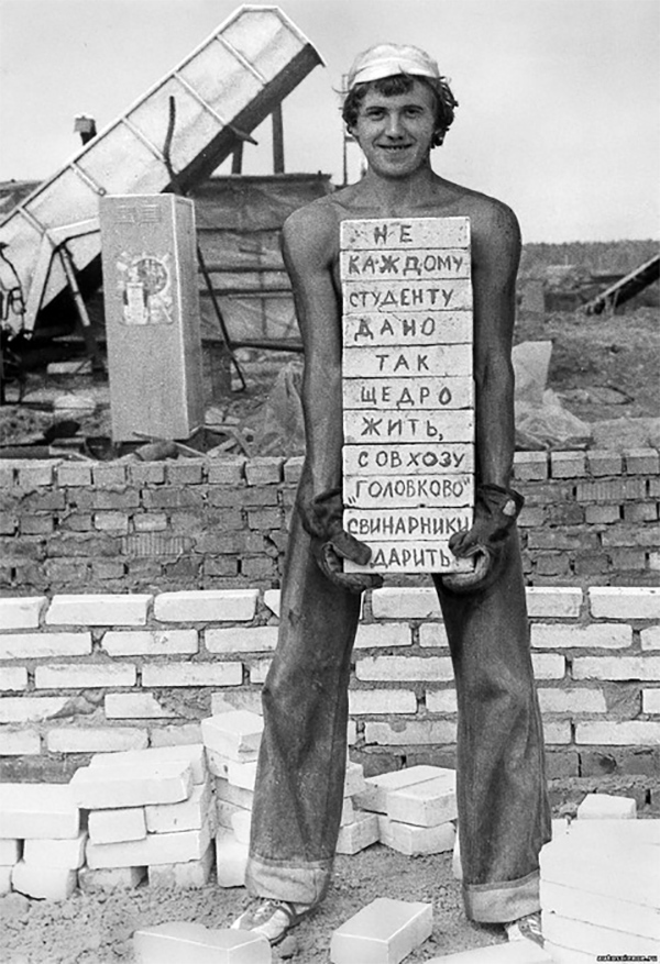 Фотографии студента с кирпичом лет 50 примерно. Это студент Завода-ВТУЗа при ЗиЛе (позже МГИУ), ныне ликвидированного. Я там учился.