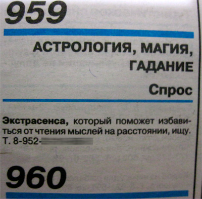 Чувак умеет читать мысли на расстоянии, объясняет Михаил. Его это по вполне понятным причинам раздражает - вы же знаете, что у людей в голове бывает. Вот он и ищет экстрасенса, чтобы его избавили от этого непосильного дара. Логично.