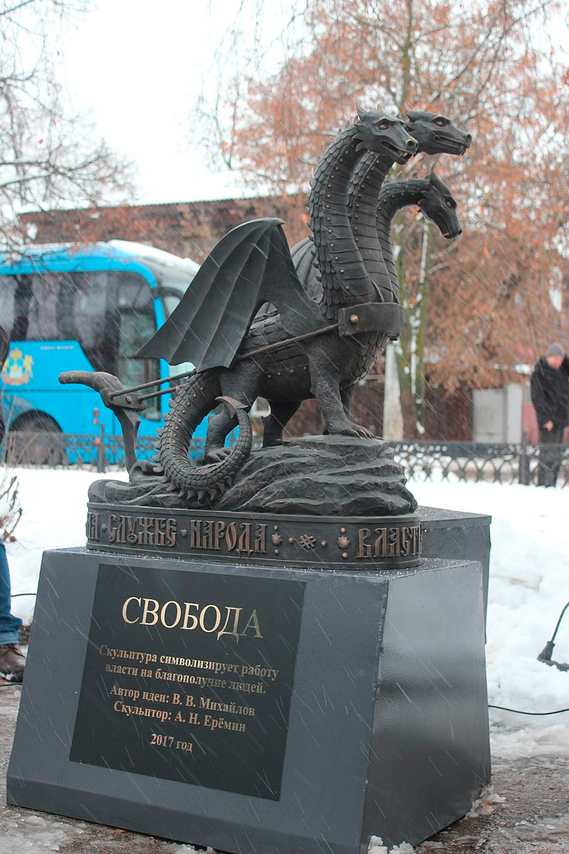 Автор идеи установки новой скульптуры – костромской предприниматель Владимир Михайлов – назвал композицию «Власть на службе народа». Сам дракон символизирует всю власть в России, а три головы – ветви власти: исполнительная, законодательная и судебная, которые должны в одной упряжке пахать на благо народа, сообщает «Народная газета».