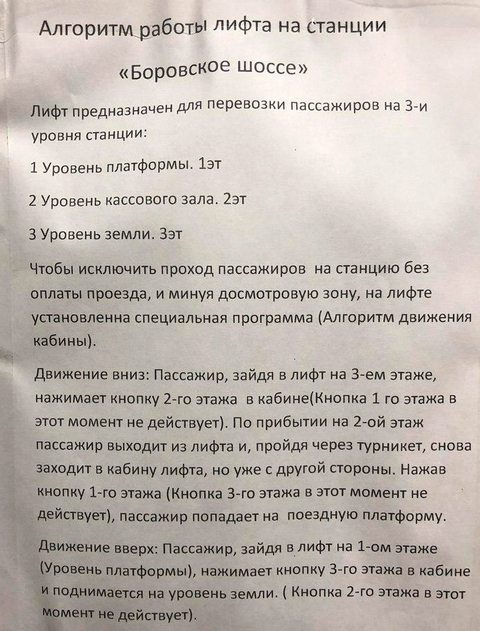 Посмотрите, вздыхает Иван, как эти рукожопы реализовали движение лифта на станции "Боровское шоссе". Специальную программу установили!