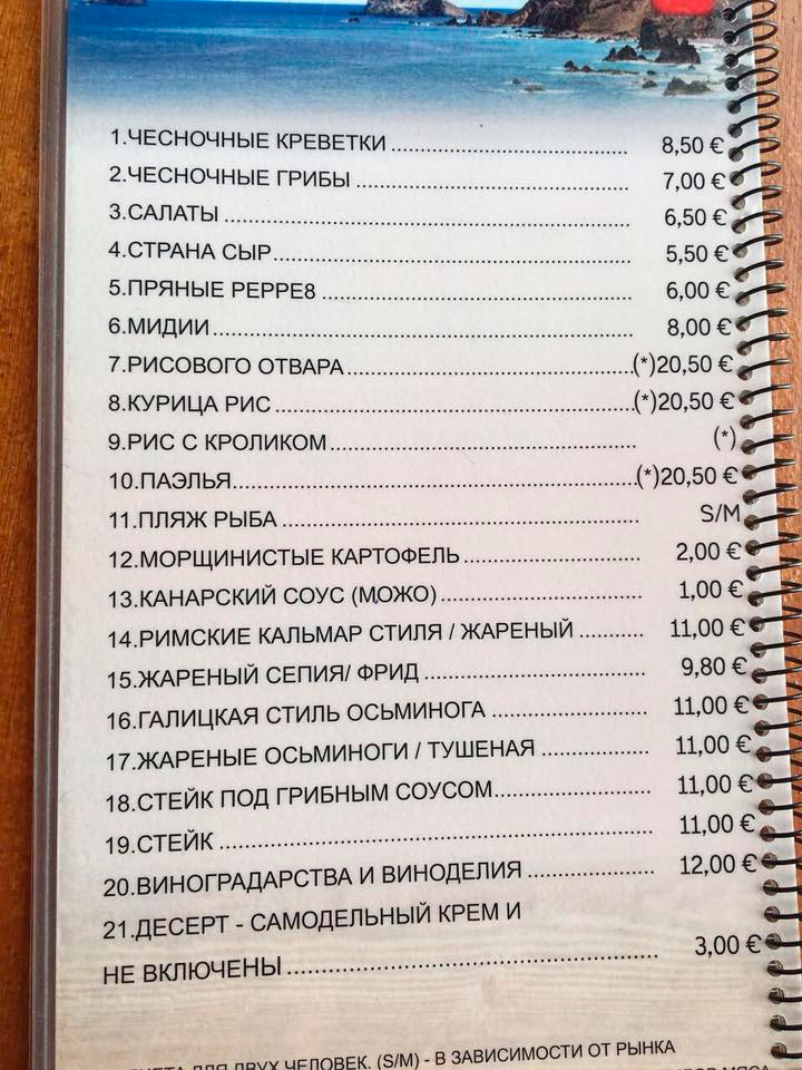 Анна рекомендует хорошее меню на Тенерифе. Картофель, правда, морщинистый, но к нему можо канарский соус. А потом виноградарства и виноделия. На десерт - самодельный крем. А что там не включены - гадайте сами.