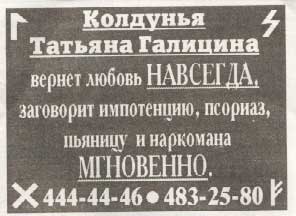 Поняли? Вернет любовь НАВСЕГДА! Интересно, правда, куда именно? Вероятно, в заранее заготовленное для нее, любви, место. Чтобы она потом больше никогда не высовывалась. Насчет же псориазной импотенции у пьяницы и наркомана... Я не сомневаюсь в том, что такая лихая тетка мгновенно его заговорит. Он даже слова не сможет вставить. Эти тетки, они такие болтливые... Особенно когда нагло называют себя колдуньями.