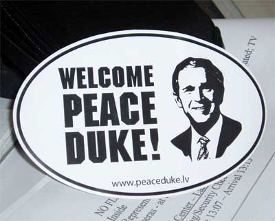 В Риге Буша встречали очень душевно, рассказала Olga Zhdanova. Даже значки специальные изготовили: "Добро, дескать, пожаловать, герцог мира!" Приветствие написали по-английски - "Пис дюк", - чтобы старина Буш мог прочитать.