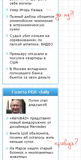 "Гисметео", рассказал Владимир, запустили новую фишку - комментарии как бы от руки к различным новостям на сайте. В общем, не надо быть семи пядей во лбу, чтобы догадаться, к чему этот дебилизм в конце концов приведет. Особенно после аналогичного эксперимента со всякими "класс", проведенного на "Говноклассниках". "Известный актер болен раком" - "Класс!" "Бабушка от голода съела кошку" - "Мне нравится!"