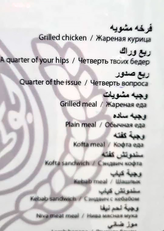 Меню вроде как в порядке, а не скрипка лиса. Кюфта более популярное написание, но и кофта встречается нередко. Кебаб тоже вероятно корректно перевели.