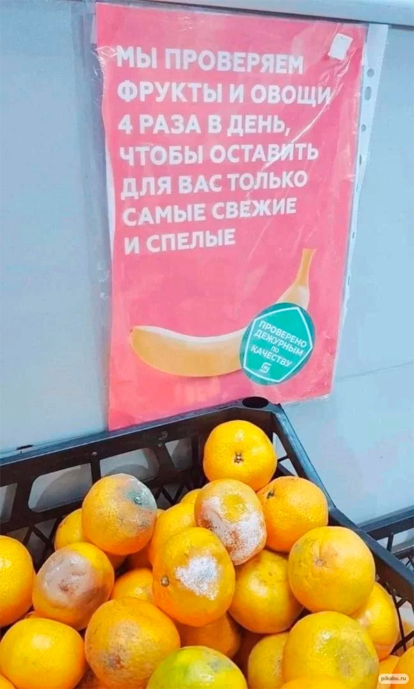 Они всегда проверяют фрукты и овощи 4 раза в день, рассказала Ирина. А почему, вы спрашиваете, мандарины гнилые? Да просто дежурный по качеству вчера четыре раза проверял отдел с алкоголем, чтобы оставить для нас только самый качественный алкоголь, а потом съел печеньку и отравился. Кроме того, это такие специальные мандарины - с благородной плесенью, как сыр. Почему сыру - можно, а мандаринам нельзя? Они тоже хотят.