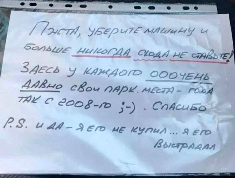 А "выстрадал" он парковочное место подобными пасквилями и, возможно, хулиганскими действиями. Заслужил, мужик 💪👍