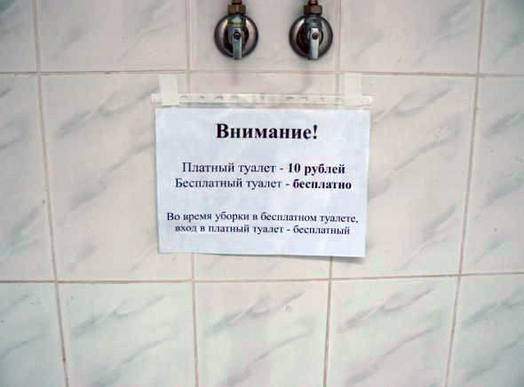 Зато хоть тут с логикой - все в порядке. Платный туалет - 10 рублей. Бесплатный туалет - бесплатно. Правда, он всегда закрыт. Потому что звериный оскал капитализма!
