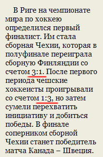 Александр восхищается чешскими хоккеистами! Нужно иметь немалое мужество и волю к победе, чтобы, проигрывая 1:3, переломить ход поединка и добиться победы 3:1. Суровый бой, понимаешь, ведет ледовая дружина!