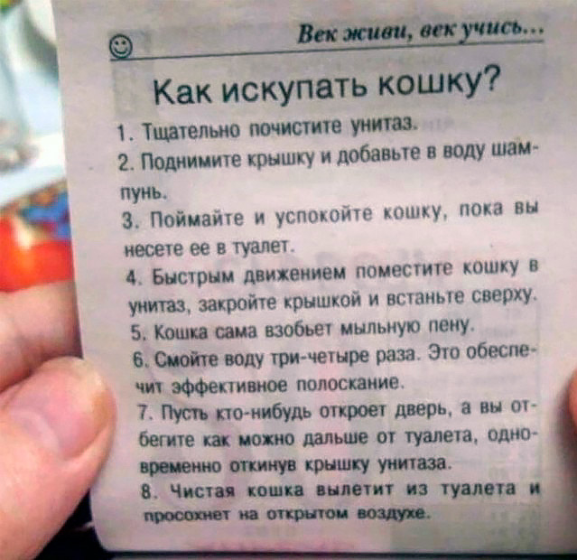 8) чистая кошка вылетит из туалета и просохнет на открытом воздухе