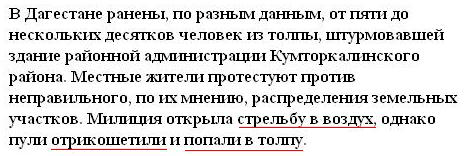 Милиция стреляла явно в молоко, но пули срикошетили от бидона и убили двести пятьдесят шесть человек. И машина "Жигули", которую взорвали из гранатомета, совершенно случайно оказалась на пути снаряда: милиционер на самом деле стрелял в ворону, которая своим противным карканьем мешала митингующим.