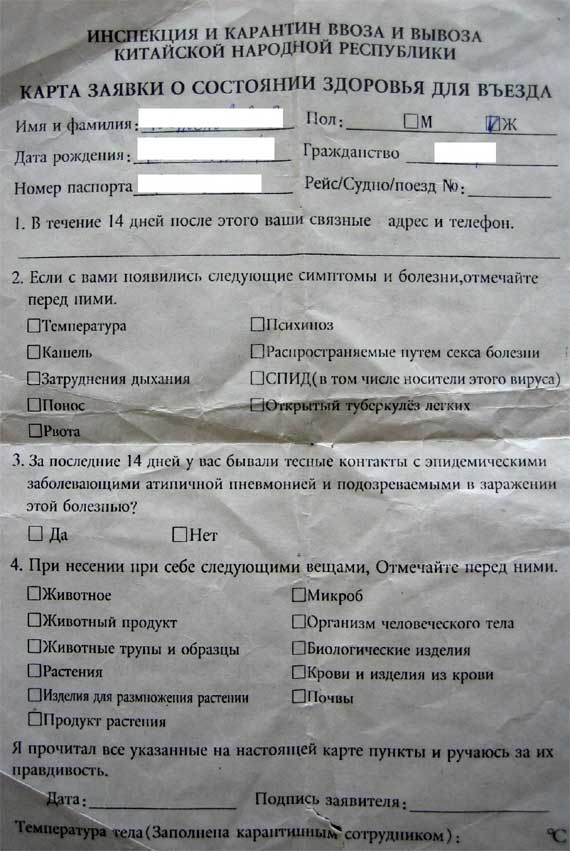 При въезде в Китай, как рассказала Валентина, издевательства над русским языком только усиливаются. Вот какую анкету следует заполнять на границе:
