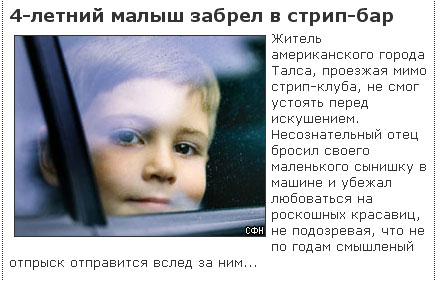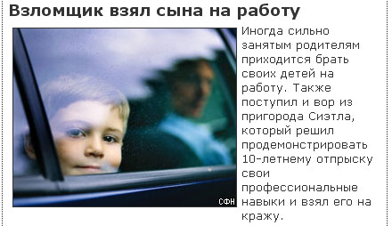 Эрбэкашное агентство СФН давно прославилось тем, что берет откуда угодно фотографии, ставит там свою аббревиатуру и выдает за свои. (Как-то раз они взяли мою личную персональную фотографию, влепили туда свой гребаный логотип и выставили ее на РБК.) Однако сейчас все претензии к СФН сняты, считает Тюрин А.В. Они оказались настолько шустрыми, что успели-таки сфотографировать несчастного мальчика, отец которого - чистая гадюка: живет то в Талса, то Сиэтле, а сынульку то в машине запирает, то на взлом с собой берет.