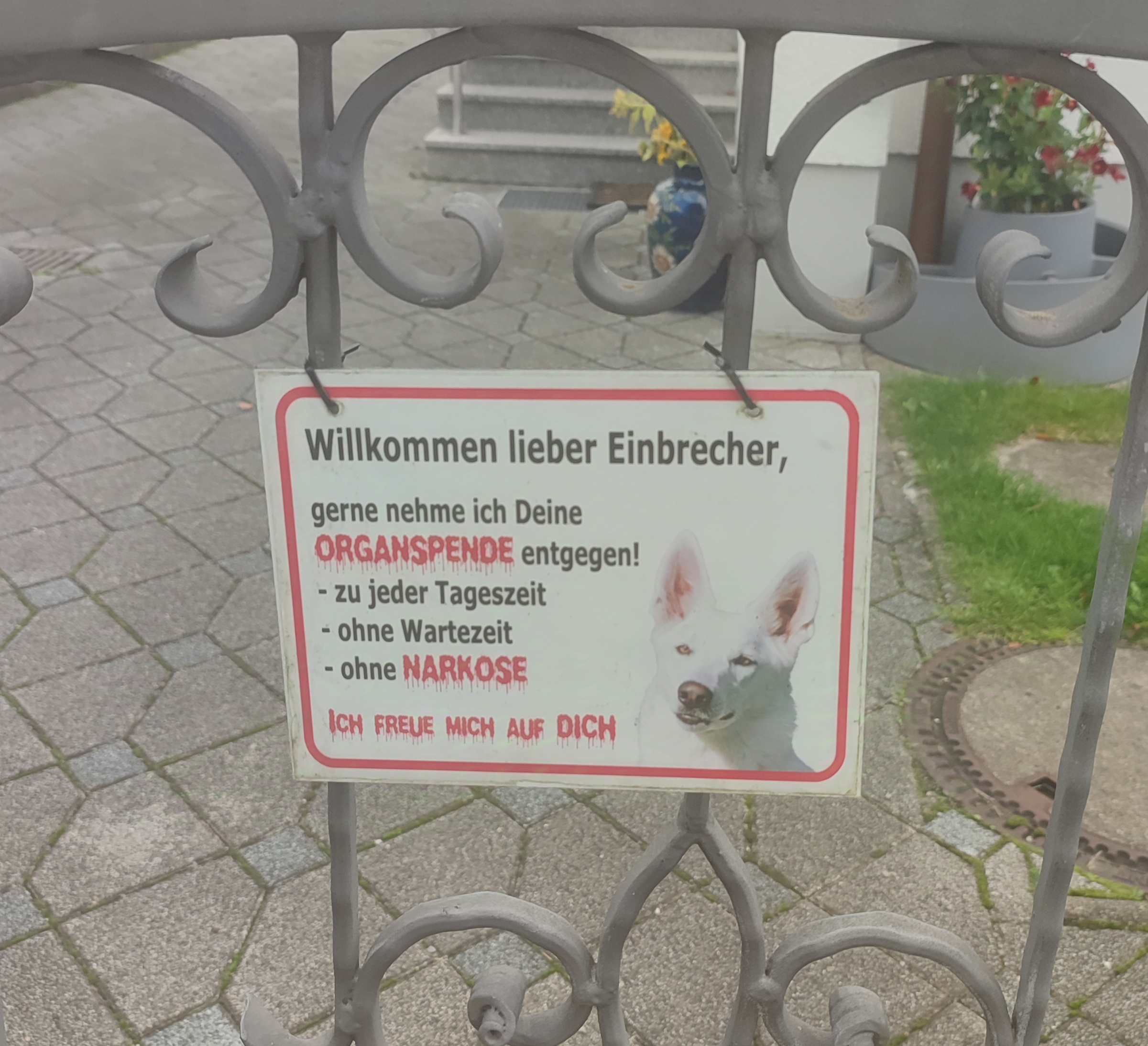 Немецкая надпись гендерно-нейтральна. В немецком (в отличие от русского) в первом лице глаголы не имеют женской и мужской формы. Но собака мило улыбается - значит точно девочка. Если бы это был мальчик, он бы хмурился.
