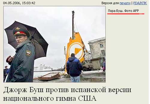Лора Буш, грустит Lighter, страдает от определенного вида сексуальных извращений, когда человека тянет переодеваться в совершенно несвойственную ему одежду: французская горничная, костюм бейсболиста и так далее. Правда, что приятно, миссис Лора выбрала костюм московского милиционера. Почему именно московского? А вы посмотрите на взгляд миссис Буш! Это взгляд именно московского милиционера, мгновенно оценивающего возможность наличия, а точнее, отсутствия у вас регистрации.