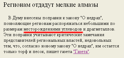 А ведь регионам опять придется обломиться, печально замечает Gleb G. Shegai. Вроде как в Думе приняли закон "О недрах", позволяющий регионам распоряжаться своими алмазами, но, если внимательно прочитать новость, выясняется, что регионам разрешили всего лишь распоряжаться углеводами в своих организмах, а не углеродами, из которых состоят алмазы.